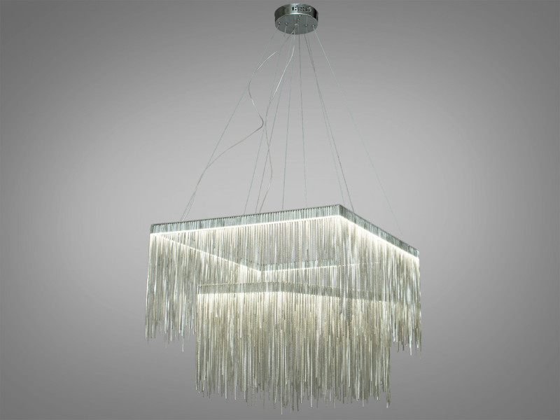 Ця каскадна світлодіодна люстра поєднує строгу геометрію та світлову пластику. Квадратна основа з хромованого металу доповнена металевими нитками, які звисають на тросах і утворюють об’ємний ефект водоспаду. Акриловий розсіювач рівномірно розподіляє потік світла, що допомагає уникати різких відблисків і робить освітлення комфортним для очей.