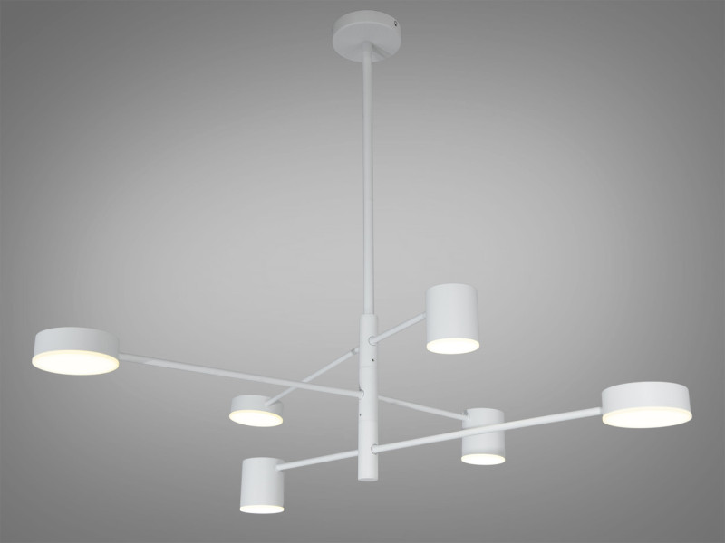 Ця світлодіодна підвісна система серії D302-6WH забезпечує світловий потік 1650 люмен, що робить її ефективним рішенням для основного освітлення кімнат невеликого розміру або акцентного підсвічування окремих зон. Модель виконана у чистому білому кольорі з використанням металевого каркаса та шести матових циліндричних розсіювачів, що формують багатовекторне світло. Якщо ви плануєте замовити білу LED люстру з асиметричним дизайном, цей варіант потужністю 30Вт запропонує сучасну естетику хай-тек та м'яке заповнювальне освітлення для вашого простору.